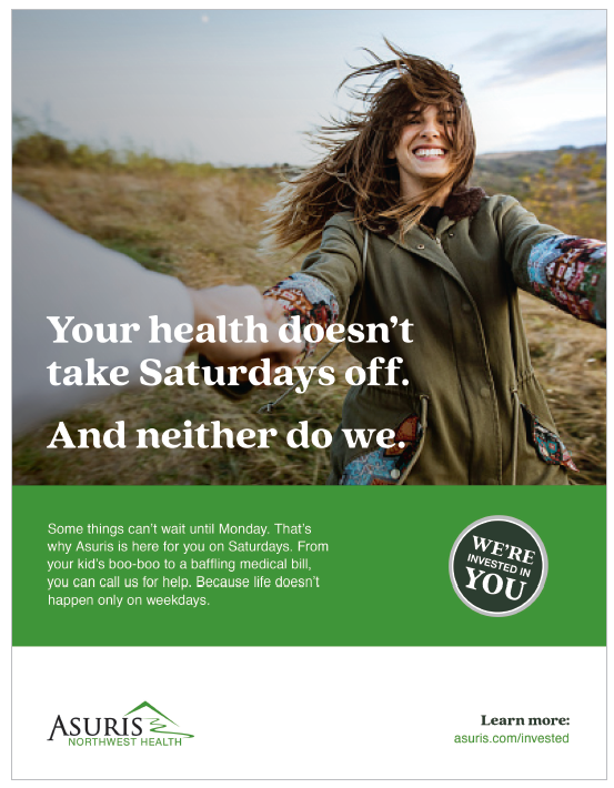 Work included researching brand differentiators (e.g., I discovered the Asuris customer service team was available on Saturdays, unlike their competitors), creating a tagline ("We're invested in you" not expensive office buildings and administration), and developing B2C and B2B copy for ads (print, digital and social ), out-of-home media (billboards, airport, Gonzaga University stadium), a video script; and landing page copy.